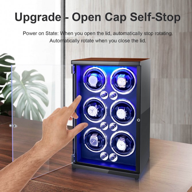When you open the lid, it automatically stops rotating. Note: To turn on/off this function, you need to press the switch on the back for control. The innovative design makes it easier for you to pick and place the watch.