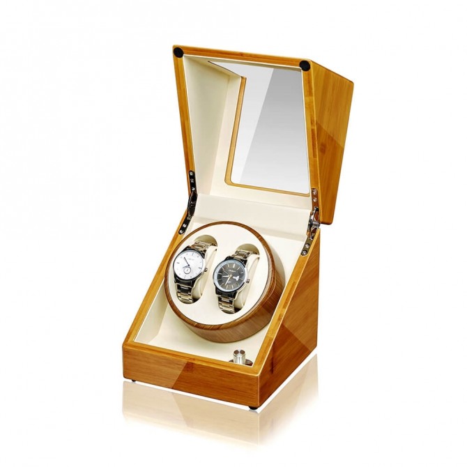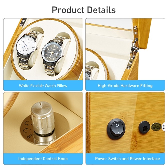The watch winder is made of high quality bamboo, which is very environmental-friendly, and the pillow is made of leather which is soft and can protect watch well.