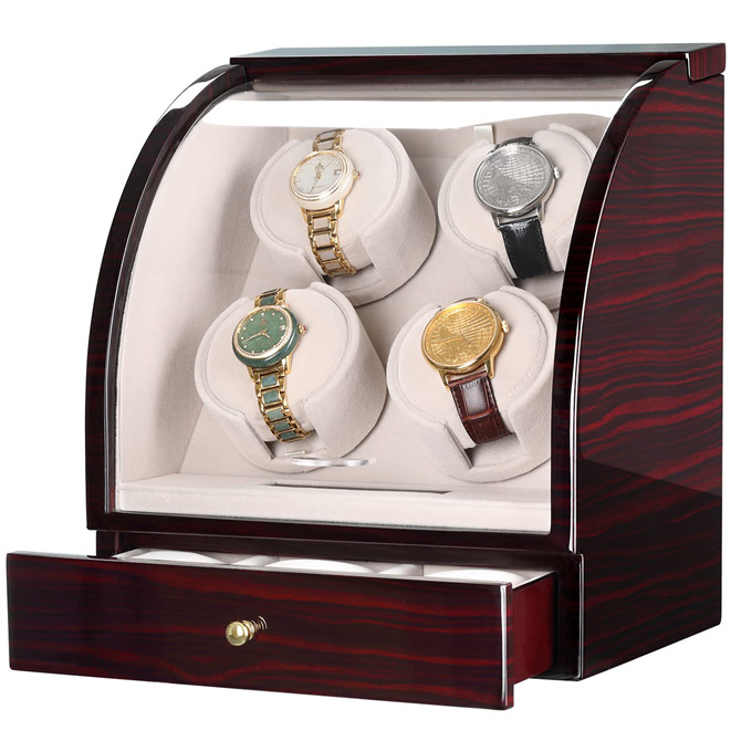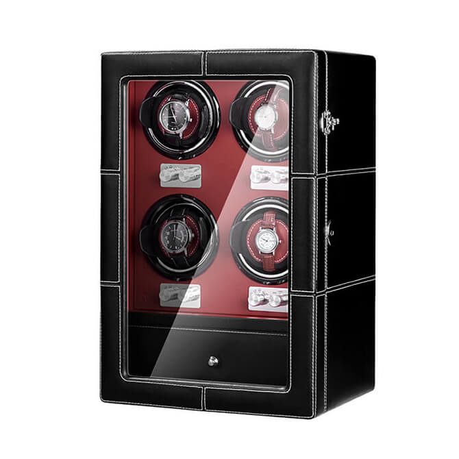 There are 10 winding modes to choose from to match different brands of watches. There are four winder spaces and four storage spaces in the watch winder to accommodate your needs, and the storage space in the watch winder uses a drawer design that is more dustproof. The black and red watch winder are understated and elegant, with very smooth and neat wiring on both sides.