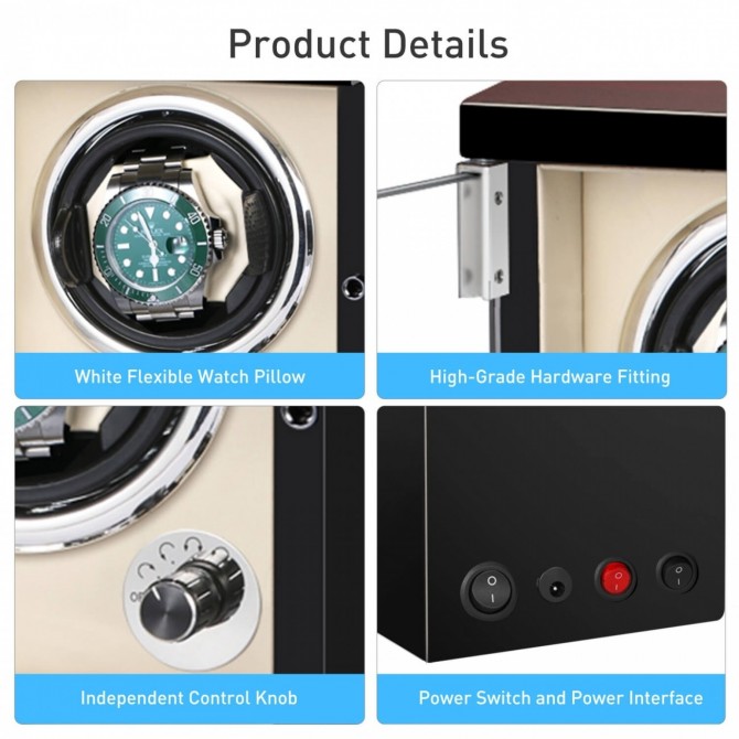 The watch winder is in ebony wood pattern and off-white color which makes our product more beautiful and fashionable.