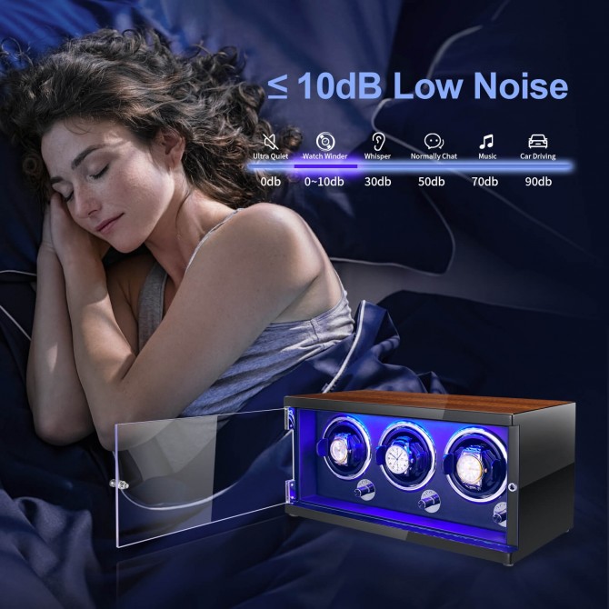 JQUEEN automatic watch winder is driven by a Japanese super silent motor, with noise as low as 5 dB to rotate your watches quietly and safely, with no running noise. The elegant LED light effect makes your watch impressive at any time