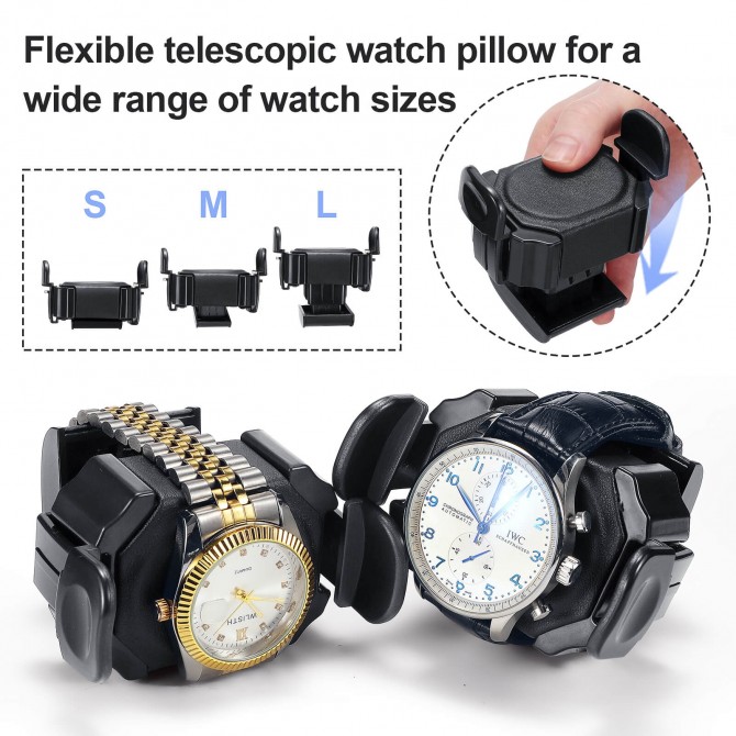 The watch winder is made of carbon fiber which is resistant to high temperature and corrosion, while the pillow is made of leather which is soft and can protect watch well.