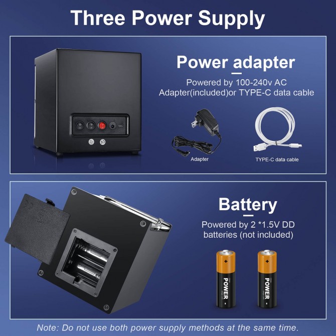 Watch Winder Powered by 100-240V AC Adapter(included) or Type-C data cable or 2*1.5V DD battery (not included). Type-C data cable power makes the product more portable and suitable for outdoor travel to provide dynamic energy for other watches. Note: Only one type of power supply can be used when powering the single watch winder.