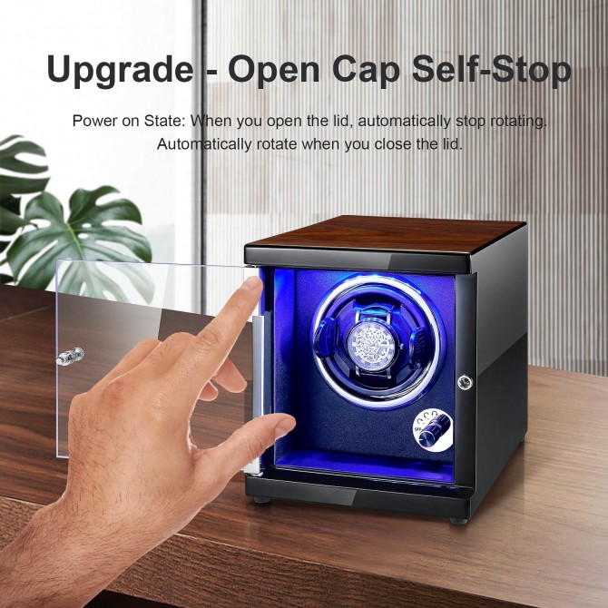 When you open the lid, it automatically stops rotating. Note: To turn on/off this function, you need to press the switch on the back for control. The innovative design makes it easier for you to pick and place the watch.
