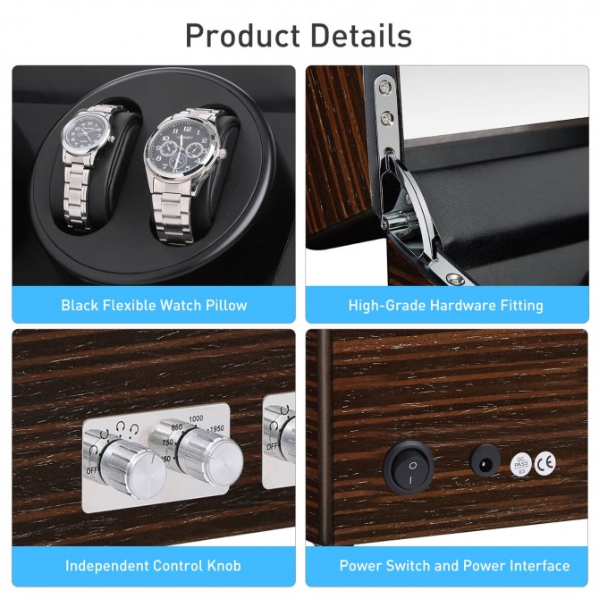 The watch winder is made of high quality wood, which is very environmental-friendly, and the pillow is made of leather which is soft and can protect watch well.