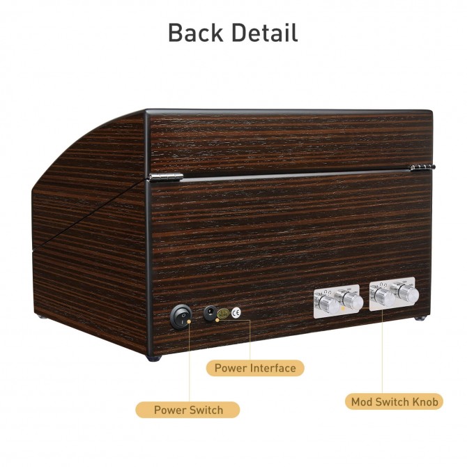 There are 2 knobs to set up winding, one is direction rotation knob which has off, clockwise, counter-clockwise, alternating clockwise/counter-clockwise, 6 hour-delayed and another is TPD setting knob which can set up 650, 750, 850, 1000, 1950 TPD. These modes can keep your watches running more accurately.