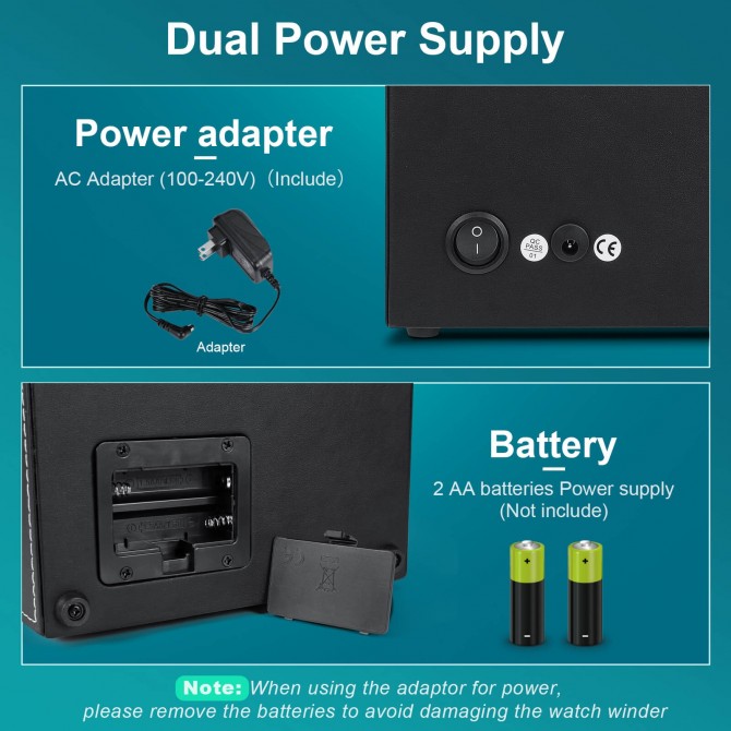 Watch Winder Powered by 100-240V AC Adapter(included) or 2*1.5V DD battery (not included). Note: Only one type of power supply can be used when powering the single watch winder.