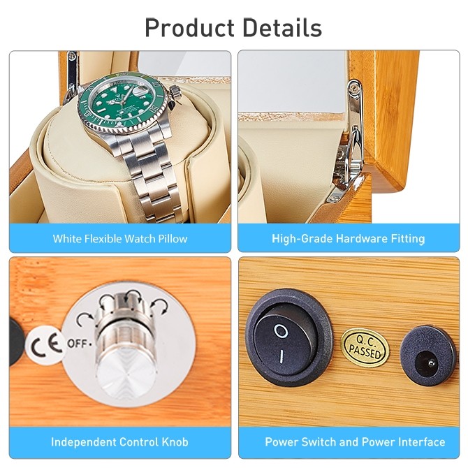 The watch winder is made of high quality bamboo, which is very environmental-friendly, and the pillow is made of leather which is soft and can protect watch well.