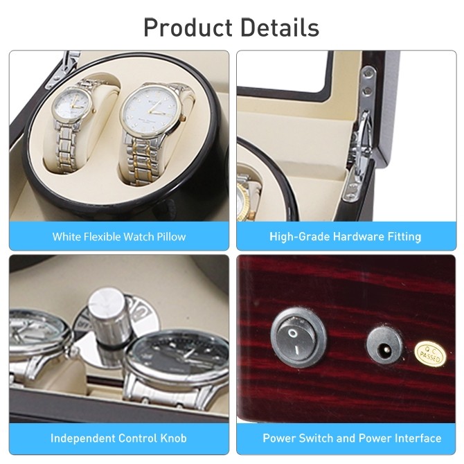 The watch winder is made of high quality wood, which is environment-friendly, and has exquisite wood grain, while the pillow is made of leather which is soft and can protect watch well.