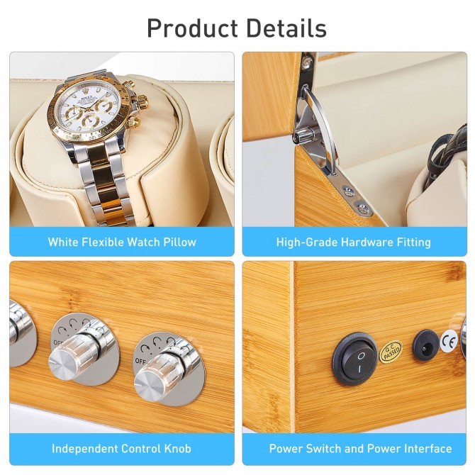 The watch winder is made of high quality bamboo, which is very environmental-friendly, and the pillow is made of leather which is soft and can protect watch well.