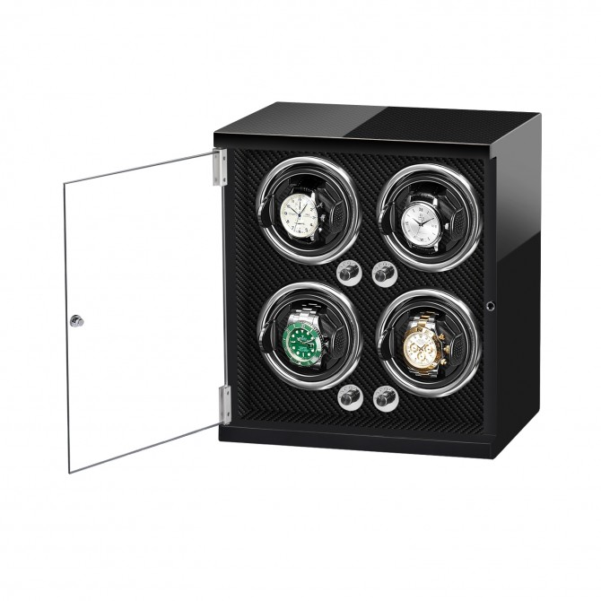 The watch winder is made of carbon fiber which is resistant to high temperature and corrosion, while the pillow is made of leather which is soft and can protect watch well.